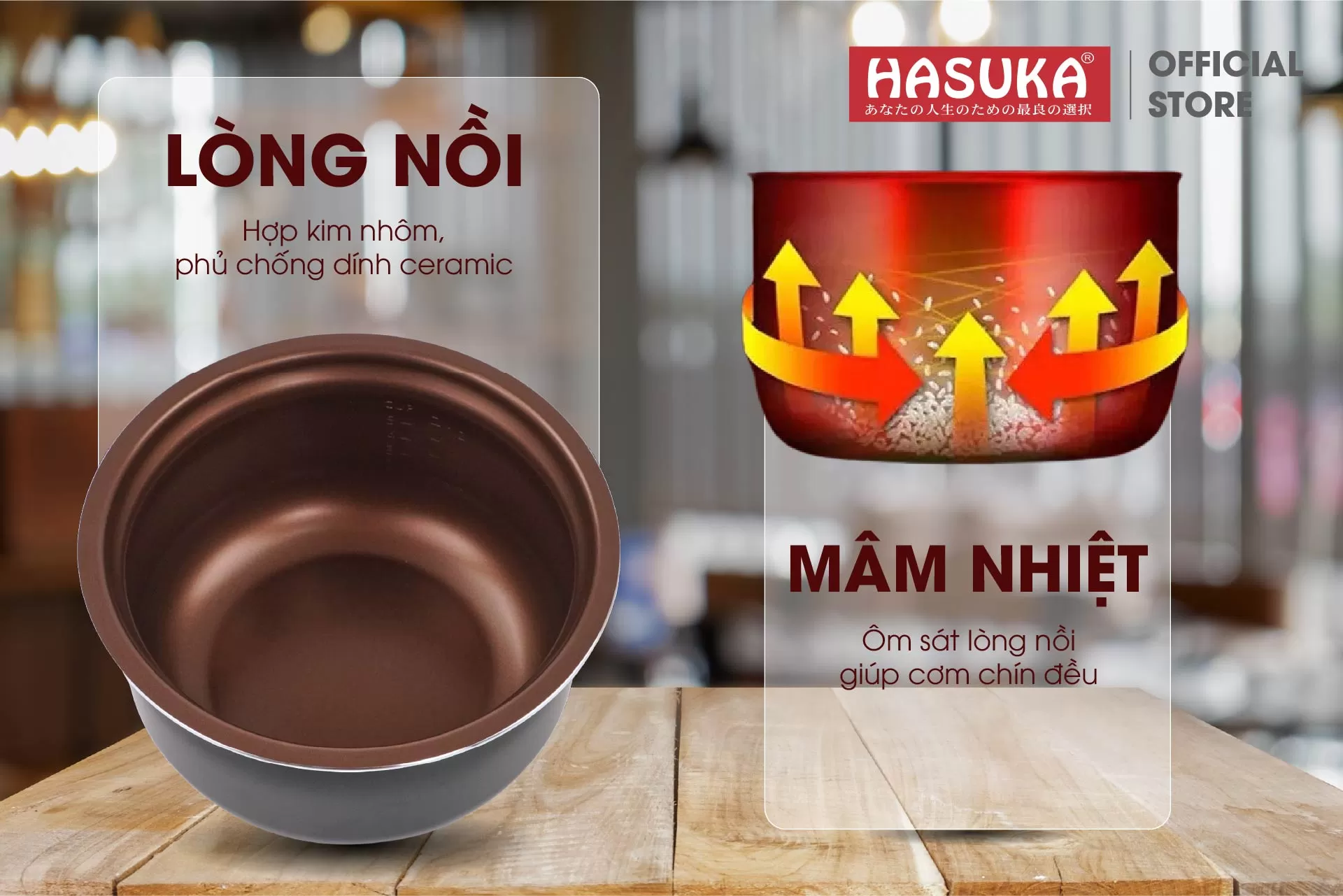 Lòng nồi cơm HASUKA HSK-801 được sản xuất từ hợp kim nhôm phủ chống dính ceramic màu cà phê, chống xước siêu bền đặc biệt an toàn cho sức khỏe.